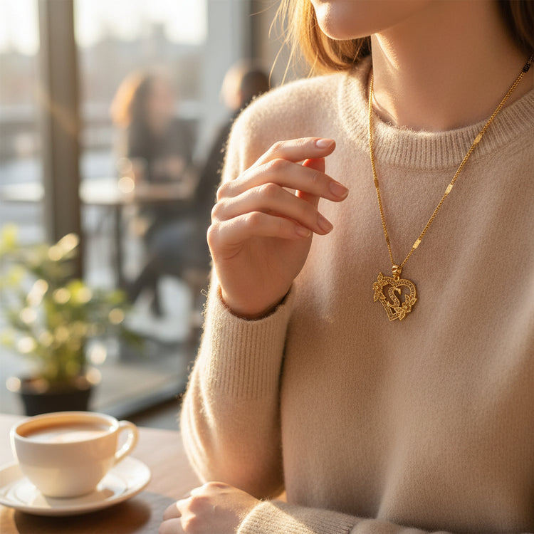 The Amour Crest Initial Necklace is a timeless symbol of love, identity, and elegance. Designed with a heart-shaped silhouette and framed by delicate floral accents, this piece centers around a personalized initial, making it deeply meaningful and effortlessly luxurious.