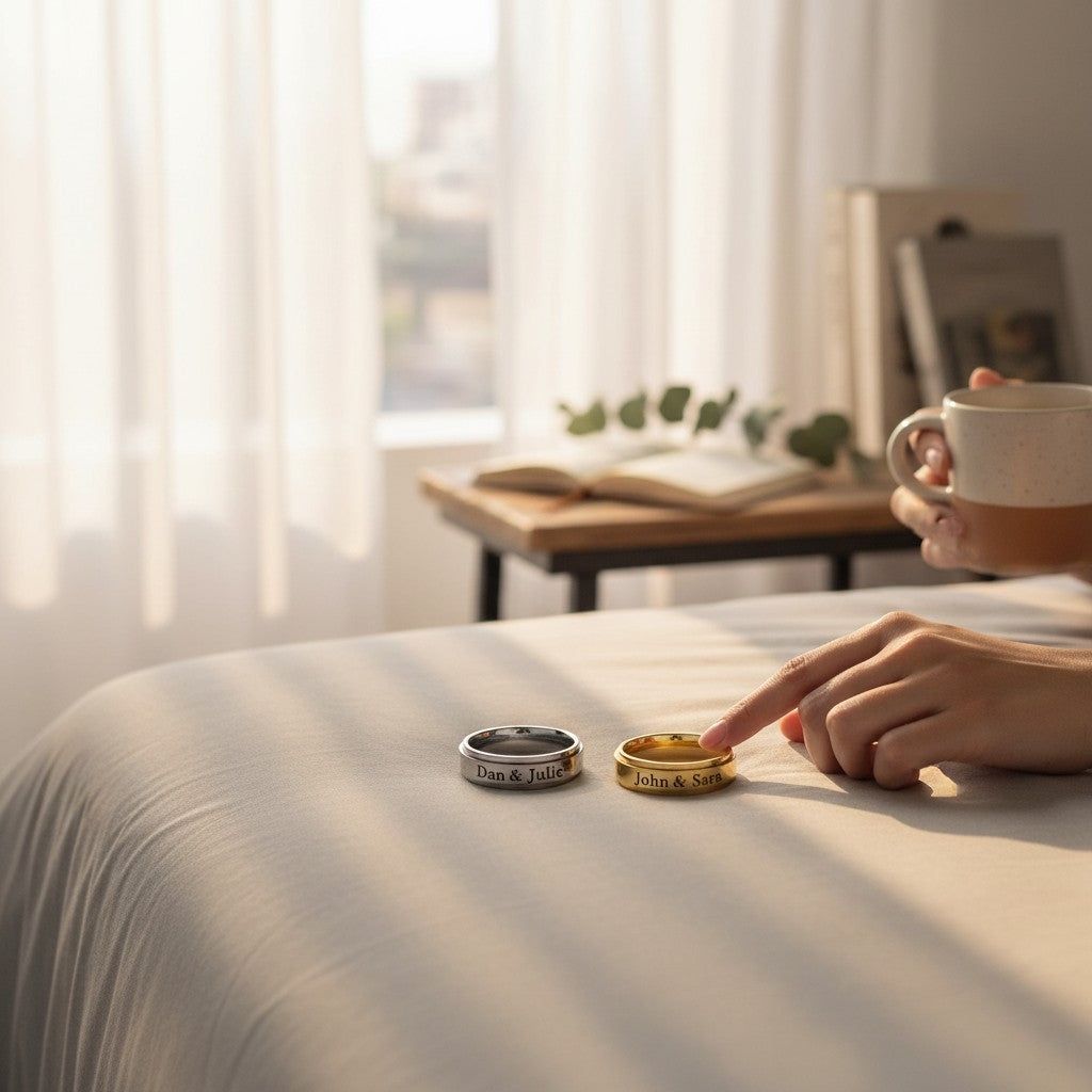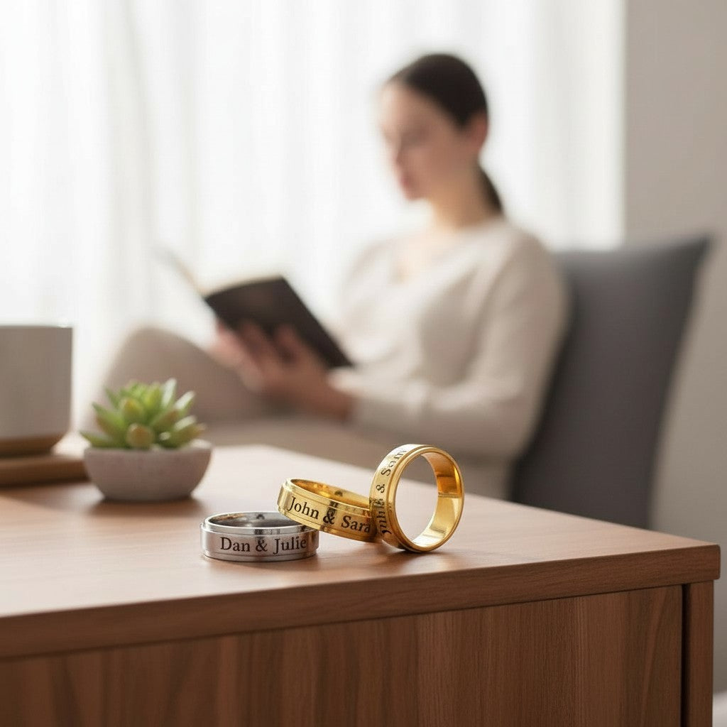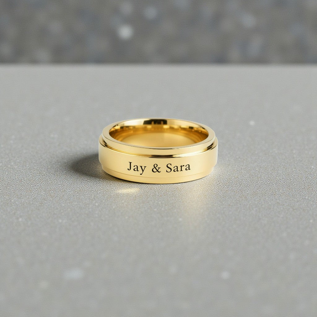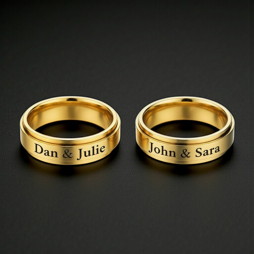 Celebrate unity, devotion, and shared story with The Eternal Duet Bands — elegantly crafted matching rings designed for couples who believe love deserves a lasting emblem. Formed from premium stainless steel and finished in radiant gold plating, each band is engraved with your chosen names, creating a bespoke symbol of connection that transcends trends and time.