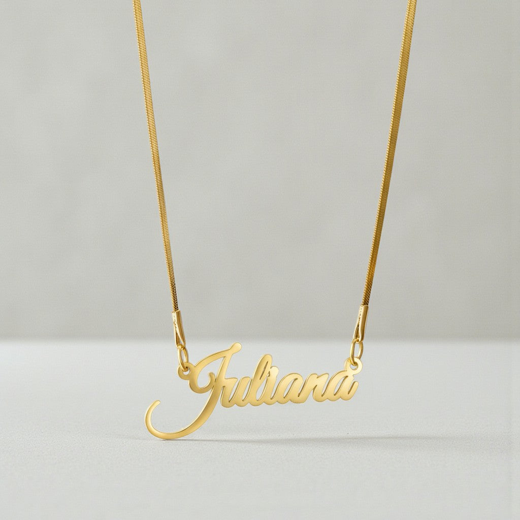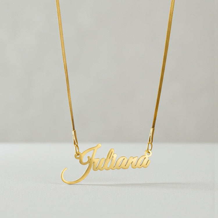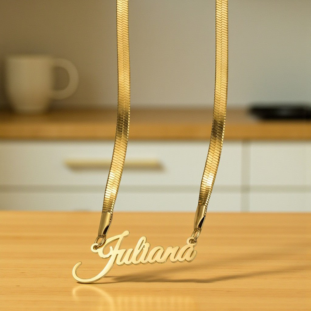 Introducing The Herringbone Signature Name Necklace — an elegant fusion of timeless luxury and personal expression. Hand-crafted with a smooth, reflective herringbone chain that drapes like liquid gold, this necklace becomes the perfect canvas for your custom name or meaningful word.